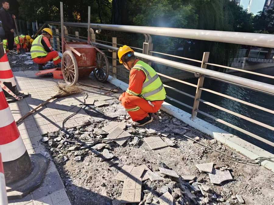桥面原地砖已凿开计帐。马蒋荣摄