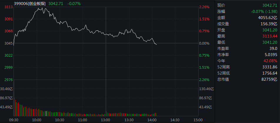 14:05 创业板指止涨翻绿,早盘一度涨超2%;通讯、新动力权重握续回落,中际旭创跌超3%,阳光电源、胜宏科技双双转跌。