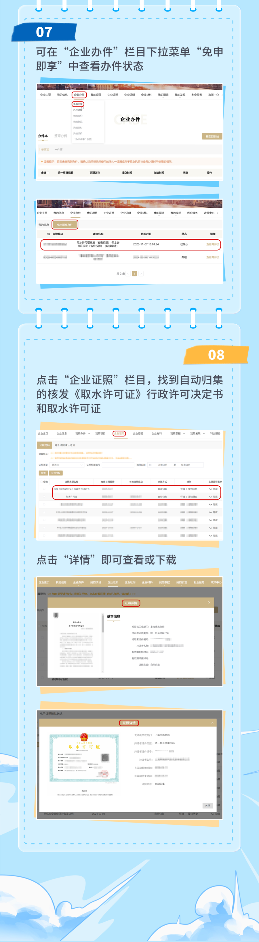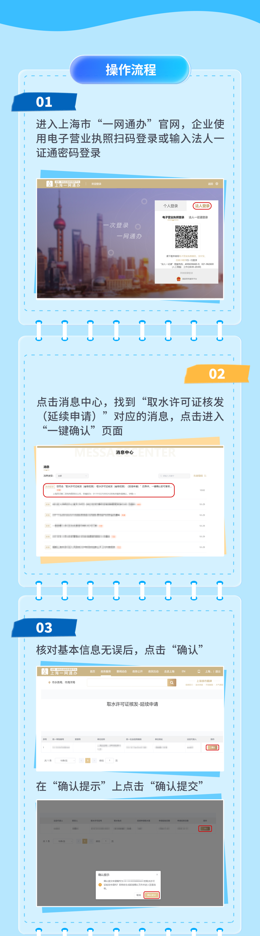 打水许可证核发(无间肯求)通过数据分享、大数据分析、东说念主工智能扶助结束“免申办”工作,结束形态为“一键说明,免于填报”。在打水许可证行将到期时,企业会自动收到音信指示,惟有登录“一网通办”,大开音信中心,按照指点进行点击说明,就不错办理核发打水许可证(无间肯求)。