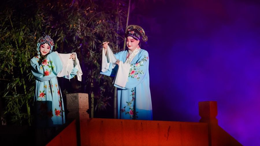 上演分为“古韵”“新声”两大篇章:昆曲《牡丹亭·惊梦》的唱段自榭中褭褭腾飞,百年园林转眼化身为水上戏台,仙乐飘飘;“海派评弹”《江南好征象》的“丽调”婉转动荡,吴侬软语随水纹层层漾开;现代风民乐演奏则节律灵动,奏响时期新声……