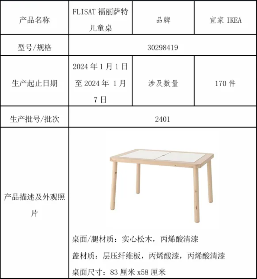 上海市阛阓监管局今天(11月14日)公布的产品调覆信息涌现,宜家(中国)投资有限公司2025年11月13日至2026年2月12日调回2024年1月1日至2024年1月7日坐蓐的宜家IKEA牌FLISAT福丽萨特儿童桌,合计170件。