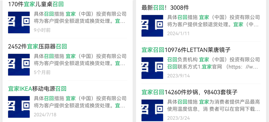 值得细心的是,2023年以来,宜家(中国)投资有限公司已至少6次调回相关产品,除了这次调回的儿童桌,还触及14260件FRUKTKAKA弗鲁卡卡印式炒锅、98403套KUNGSTIGER坤蒂格筷子,10976件LETTAN莱唐镜子,3008件ASKSTORM奥斯通40瓦USB充电器,253件VARMFRONT旺芙荣转移电源,2452件VÄRDEFULL瓦福压蒜器。