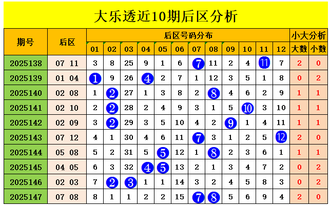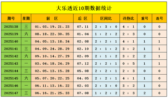 上期转头:大乐透第2025147期奖号为:前区06、16、21、25、33,后区07、08,前区奖号三区比为1:2:2,冷热比为2:3,后区开出大大组合07、08