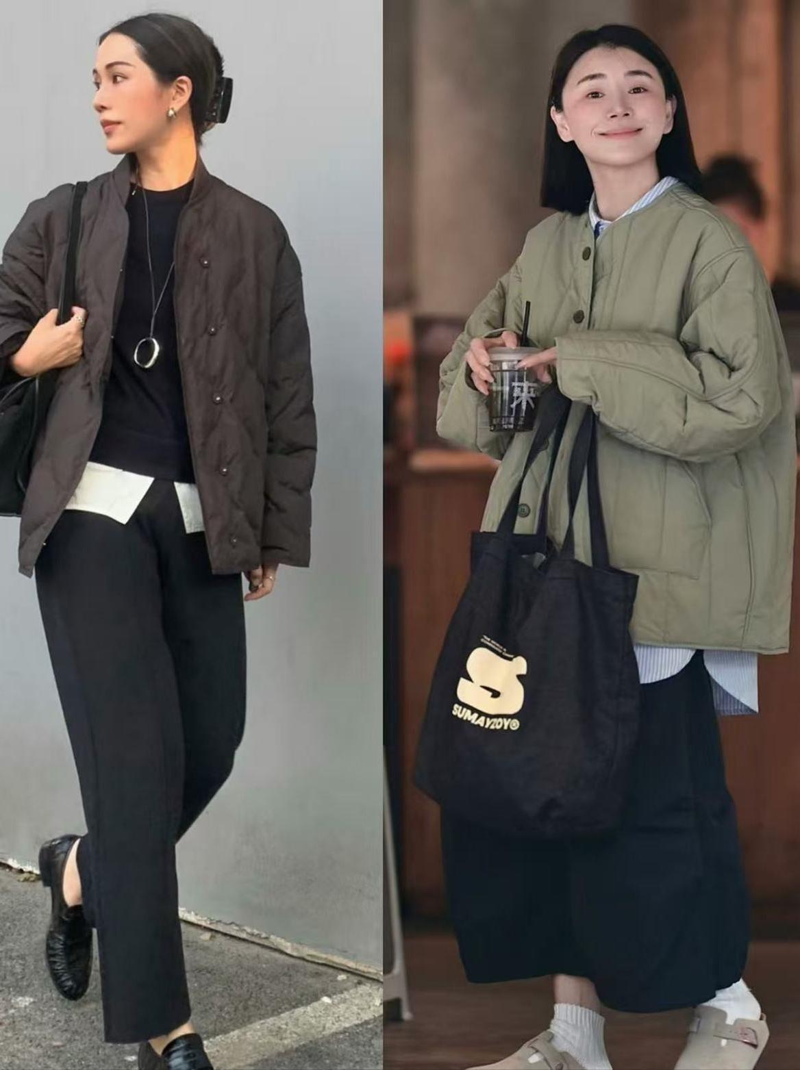 相同是绗缝棉服,然而搭配的夏装不同,呈现出来的后果有着很大的分辨,举例上头左边这位前卫博主,用一条玄色的直筒9分西装裤在搭配上深咖色的绗缝棉服,叠穿玄色竭诚衫和白色衬衫衫,这么的穿搭通勤斯文又干练。