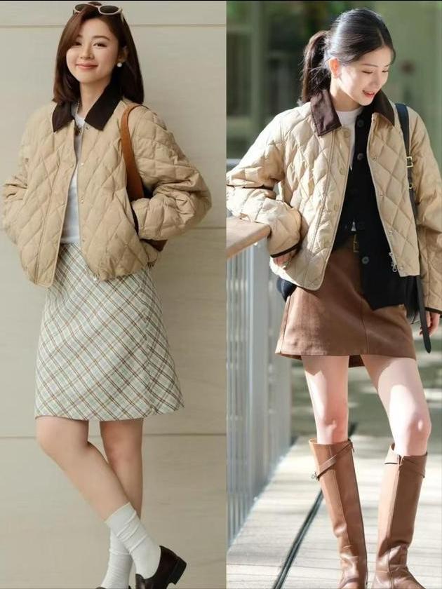 遴荐底下这种短款的浅驼色绗缝棉服,内搭一件T恤,下半身平直遴荐a字半身裙和a字短裙来组合,脚上穿了一对玄色乐福鞋,或者是棕色的皮质中筒靴,就能松驰穿出活力四射的造型。