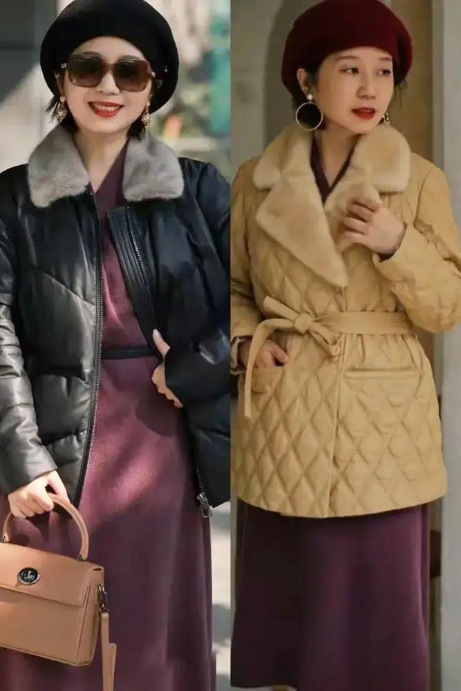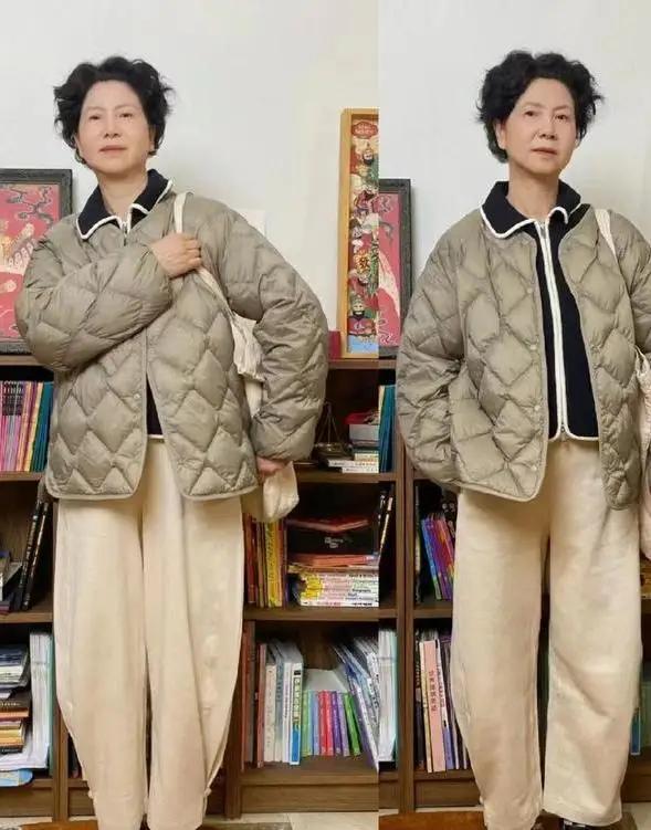 遴荐绗缝棉服,最主要的是它的缠绵走线,约略让这件一稔不会过于蓬松,穿在身上也不会显胖,正值安妥中年女性,因为东说念主到中年,身段的推陈出新变得逐渐,很容易发福发胖,这时刻我们用绗缝棉服来穿搭,能更好的修饰你的身段,像上头这位素东说念主,平直用一条浅卡其色的阔腿裤来搭配就够。