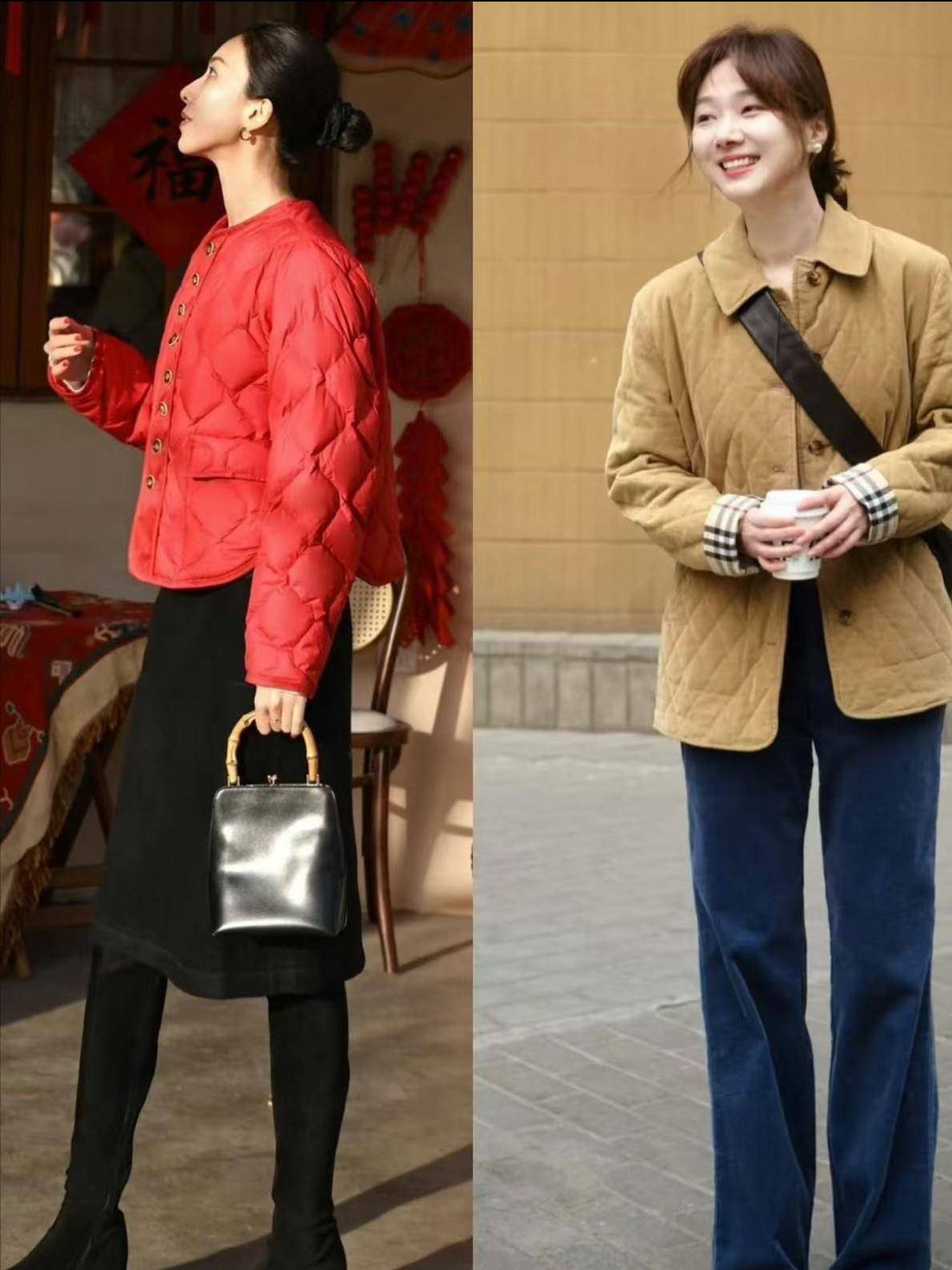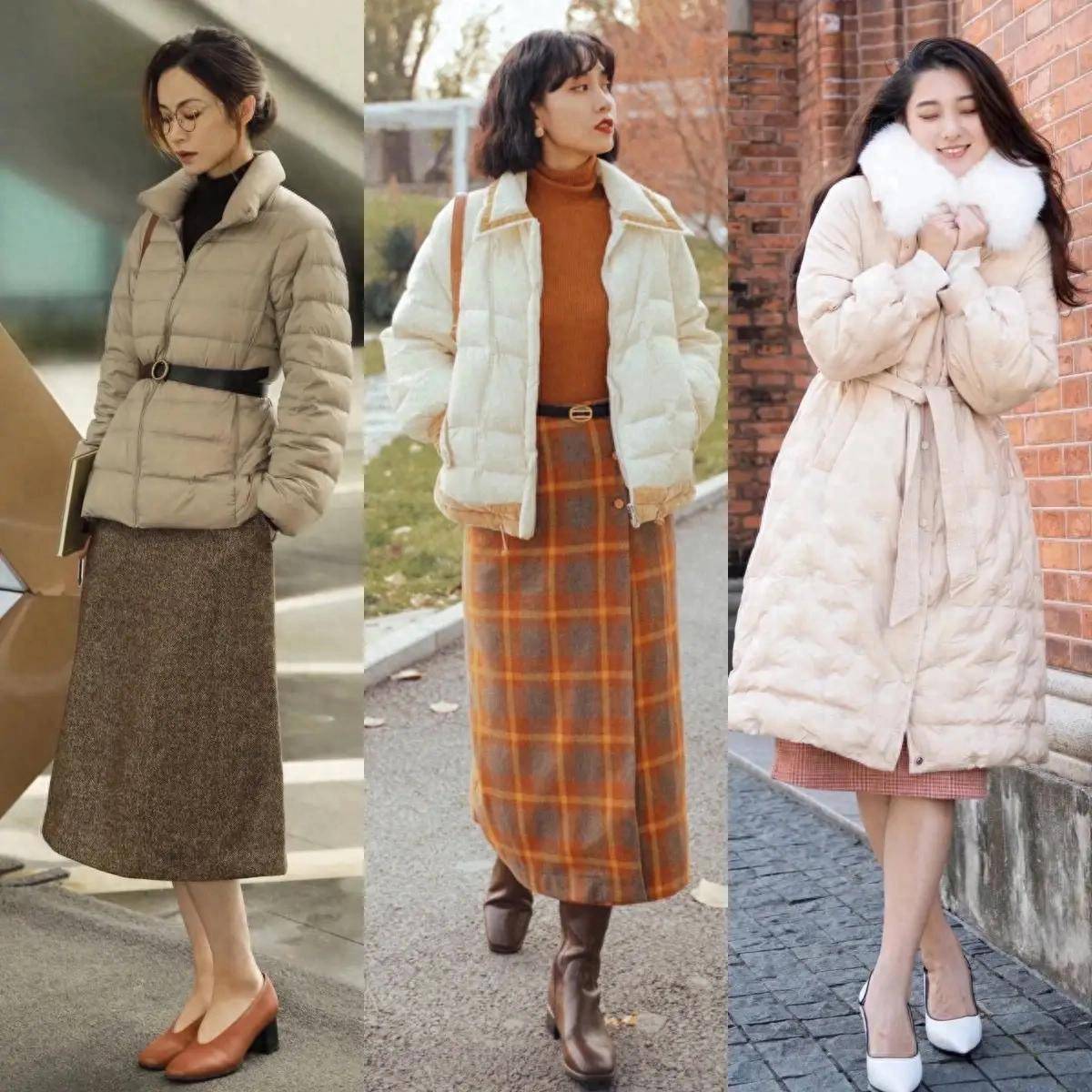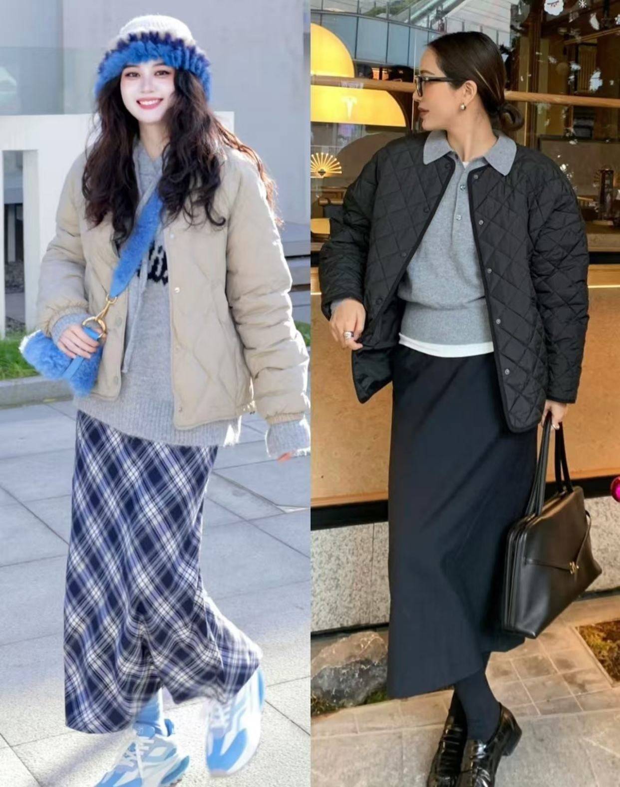 上头右边的这位素东说念主换成了自带高腰收腰款的绗缝棉服,内搭红色的半高领竭诚衫,加上口舌格纹的直筒半身裙,就显得优雅多礼,同期又能提高腰线。