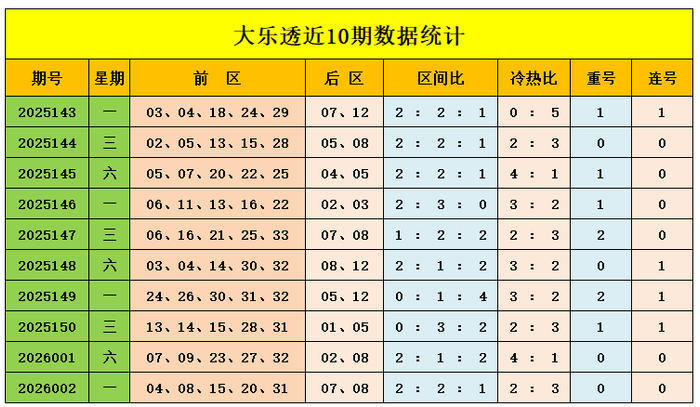 上期归来:大乐透第2026002期奖号为:前区04、08、15、20、31,后区07、08,前区奖号三区比为2:2:1,冷热比为2:3,后区开出大大组合07、08