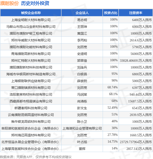 本站音尘,笔据天眼查APP清晰,濮耐股份(002225.SZ)新增一谈对外投资事件,被投资公司为阜阳谋和氢能投资合资企业(有限合资),法定代表东谈主上海谋和企业搞定有限公司,投资占比为30%。该公司从事本钱商场就业,注册本钱为10000万东谈主民币。现在,濮耐股份共存在对外投资25项天元证券_正规配资十大排名_正规配资平台官网,投资占比前20的方法见下表: